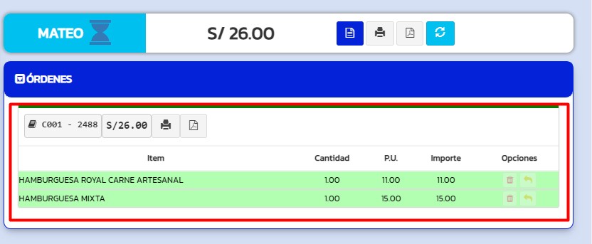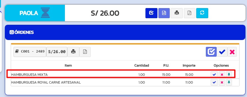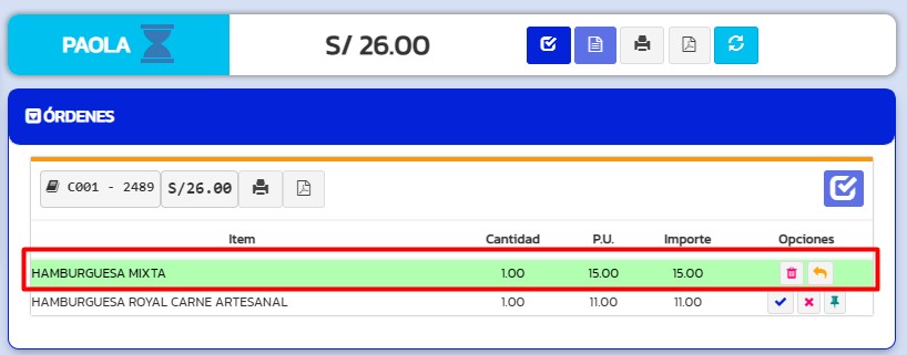 Ubicar en el ítem del orden que se desea atender. Ejemplo: Atenderemos la HAMBURGUESA MIXTA.