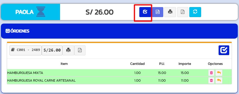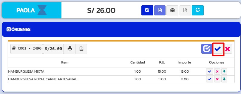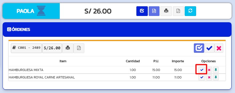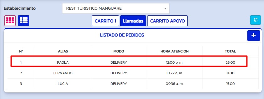 Ubicar en la lista de pedidos la orden que se desea atender. Ejemplo: Seleccionaremos la orden de PAOLA.