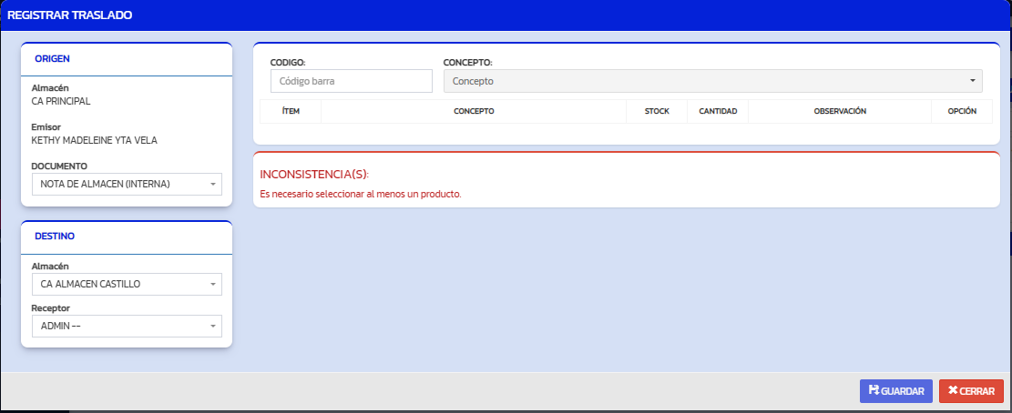 En la sección ORIGEN se muestra los datos del almacén de origen.