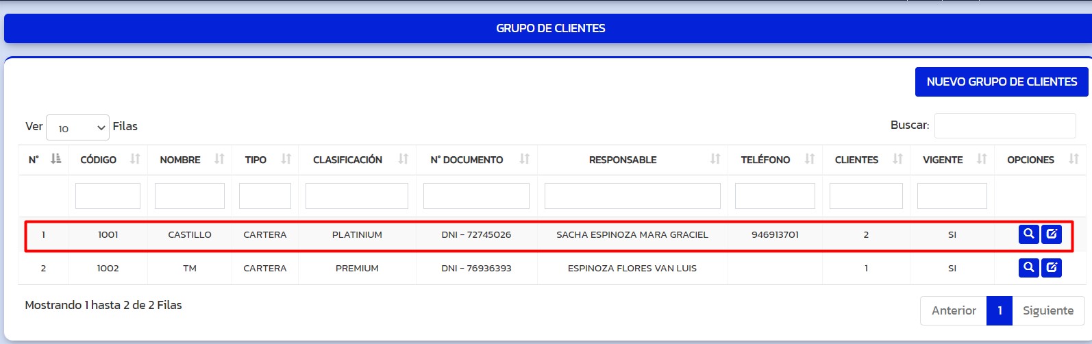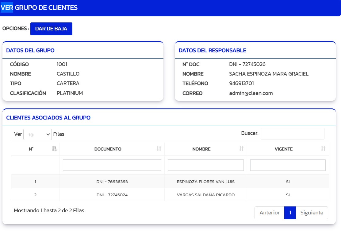 4. Se muestra todos los datos del grupo de clientes seleccionado.